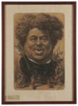 Etienne CARJAT. Portrait charge d’Alexandre Dumas. Fusain avec rehauts de craie blanche. Signé en bas à droite et daté 1859. Dessin : 48,5 x 32 cm ; feuille : 60,5 x 42,5 cm. En dessous, légende signée de Méry, à l’encre, partiellement effacée : Géant moral ou physique Prose ou vers chez lui tout plait ; Hélas ! il n'est pas complet Il n'aime pas la musique ! Dumas est représenté en pied, mais conformément aux canons du portrait-charge, avec une tête énorme envahissant presque toute la feuille, reposant sur un petit ventre bedonnant et avec des jambes minuscules. Il porte une grande plume d’oie sous le bras gauche. De ses poches s’échappent ses livres et journaux les plus fameux : Le Mousquetaire, Mémoires, Voyage, Monte-Cristo (journal d’un côté, roman de l’autre), les Trois Mousquetaires, Georges, la reine Margot. Carjat (1828-1906) a à peine accentué les traits caractéristiques de Dumas : sous la célèbre tignasse crépue immaîtrisable, la petite bouche gourmande est prête à s’ouvrir à toutes les bonnes choses de la vie, les yeux sont rieurs et malins sous les gros sourcils. L’homme respire le plaisir de vivre. Julie Anselmini et Isabelle Sapa, in Dumas en caricatures s’interrogent sur le sens de la charge qui pourrait viser « plus particulièrement l’entreprise éditoriale du Mousquetaire, d’abord destinée à la publication des Mémoires de Dumas. Il n’est bien entendu pas le seul exemple d’écrivain affecté par l’inflation du je auctorial au XIXe siècle, mais les critiques et certains de ses amis lui reprochent une mise en scène excessive de lui-même dans laquelle il galvaude son talent. » Magnifique portrait original de Dumas par un des meilleurs photographes et caricaturistes de l’époque.