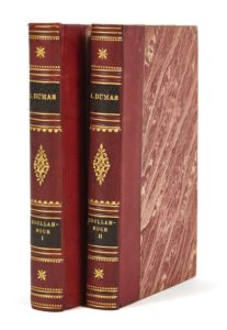 Alexandre DUMAS. Moullah-Nour. Bruxelles, Méline, Cans et Compagnie, « Collection Hetzel », s.d. [1860]. 2 volumes in-32, demi-veau cerise, filet à froid sur les plats, dos lisse orné de fleurons et de filets dorés, pièces de titre et de tomaison en maroquin noir, têtes dorées, couvertures et dos conservés, non rognés (Reliure de Canape et Corriez). 181 p., [1] f. ; 152 p., [1 f.], [1 f.] blanc, 11 pp. (catalogue). Édition originale « interdite pour la France », imprimée chez E. Guyot à Bruxelles ; le second volume est à l’adresse à Leipzig de Alphonse Dürr. Munro, 321. Coins très légèrement frottés. Infimes manques angulaires aux couvertures, quelques rousseurs. Charmants exemplaires délicieusement reliés.