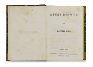 Alexandre DUMAS. Ainsi soit-il. Paris, 1858-1862. 4 tomes en un volume in-32, demi-basane fauve à petits coins, dos à nerfs orné d’un large fleuron, de grecques et de roulettes dorées, tranches jaunes (Reliure de l’époque). 160 pp., 160 pp., 160 pp., 115 pp. Édition originale. Le premier volume porte la mention : Naumbourg, à l’expédition de la Bibliothèque choisie (L. Garcke) ; les trois autres Naumbourg, chez G. Paetz qui est également l’imprimeur des 4 tomes. Ce roman fut ensuite publié sous le titre Madame de Chamblay. Commencé en 1858 il fut abandonné pendant le voyage de Dumas en Russie. Il le reprit à son retour en France, mais ne le termina qu’à Naples en 1861. Il fut inspiré à Dumas – même si le récit n’en est pas le calque – par ses amours avec une jeune Normande Emma Mannoury-Lactour (1823-1860). Emma tint une place importante dans la vie de Dumas. Abonnée au Mousquetaire, elle fut d’abord en contacts épistolaires avec lui avant de le rencontrer à l’occasion des obsèques de Nerval. Ils devinrent amants (malgré deux mariages elle était toujours vierge), et elle fut même enceinte de Dumas, mais perdit l’enfant. Dumas écrira quelques années après la mort de sa maîtresse : « Je crois bien, quoique je ne l’affirme pas, que les trois-quarts de mon cœur, sinon mon cœur tout entier, moururent avec elle. » L’intérêt littéraire du roman est indéniable, par sa composition qui rappelle celle de Pauline : trois narrateurs se succèdent : Dumas, Max de Villiers qui va devenir l’amant d’Edmée, Edmée. D’autre part, Dumas y revient sur un thème qui lui est cher, celui du magnétisme et du don de double-vue : Edmée, comme Lorenza dans Joseph Balsamo, est medium. Munro, 310. Coins frottés, rousseurs éparses. Charmant exemplaire provenant de la bibliothèque de la duchesse de Berry à Brunsee mais sans l’étiquette ni le numéro d’inventaire.