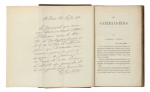 Alexandre DUMAS. Les Garibaldiens. Révolution de Sicile et de Naples. Paris, Michel Lévy Frères, 1861. In-18, demi-veau havane, dos à faux-nerfs orné de fleurons et de roulettes dorés et à froid, date dorée en pied, couvertures et dos conservés, non rogné (Reliure de Canape). [2] ff., 376 pp., fac-similé dépliant. Édition originale. L’année précédente Dumas écrivait à Gênes la fin des Mémoires de Garibaldi ou, comme il le note avec amusement, « quand je dis ‘la fin’, vous comprenez que c’est la fin de la première partie que je veux dire. Au train dont il va, mon héros promet de me fournir une longue suite de volumes. » Les Garibaldiens constitue ainsi la seconde partie des mémoires du patriote italien. Vicaire III, 425-426 ; Munro, 334. Dos pâli avec deux épidermures superficielles, mors et coins frottés, couvertures empoussiérées, très rares taches.