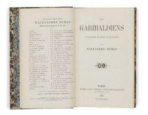 Alexandre DUMAS. Les Garibaldiens. Révolution de Sicile et de Naples. Paris, Michel Lévy Frères, 1861. In-18, demi-chagrin rouge, dos à nerfs orné de doubles caissons et de filets dorés (Reliure de l’époque). [2] ff., 376 pp., fac-similé dépliant. Édition originale. Petites traces blanches au dos, manque de papier au coin supérieur du premier plat, infimes piqures.