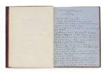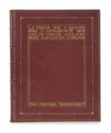 Alexandre DUMAS. La Vérité sur l’affaire d’Aspromonte. Par un témoin oculaire. [novembre 1862]. In-4, maroquin rouge, titre doré sur le premier plat dans un triple encadrement de filets dorés, dos à nerfs orné, encadrement de triple filet doré sur les contreplats, coupes filetées, emboitage toilé (Reliure de Sangorski et Sutcliffe). [2] ff. (titre calligraphié postérieurement et note dactylographiée), 57 ff. manuscrit autographe complet Le texte a paru en italien à Milan aux Editions Scorza, sous le titre La Verita sopra i fatti di Aspromonte, narrati da combattente testimonio oculare e riconosciti dal generale Garibaldi, et en français dans la Revue contemporaine du 30 novembre 1862. Le manuscrit, qui comporte quelques ratures et corrections, présente aussi quelques différences avec le texte imprimé. Il s’agit du récit fait par un jeune lieutenant hongrois à qui Dumas donna l’hospitalité à Naples. Proscrit après la bataille d’Aspromonte, il l’aurait laissé à Dumas qui le publia, après l’avoir communiqué à Garibaldi qui l’aurait reconnu conforme en tous points à la vérité. Il y décrit la manière dont il demanda un congé à son colonel pour aller rejoindre Garibaldi en Sicile, les armes qu’ils apportèrent, la rencontre avec Garibaldi, la recherche de volontaires, les marches et les sentiments des villageois qu’ils rencontrent, la bataille, la défaite et la capture de Garibaldi. Mors un peu frottés, emboîtage un peu bruni.