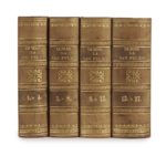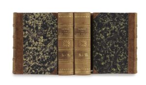 Alexandre DUMAS. La San Felice. Roman de mœurs. Paris, 1864-1865. Naumbourg, Chez G. Paetz. 17 tomes en 4 volumes in-32, demi-basane fauve à petits coins, dos à nerfs ornés d’un, fleuron, de grecques, roulettes et filets dorés, pièces de titre et de tomaison en maroquin havane, tranches jaunes (Reliure de l’époque). Volumes 1 à 17 : 160 pages chacun ; volume 17 : 140 pp., [2] catalogue. Un hommage rendu à son père le général Dumas L’édition originale a paru chez Michel Lévy également en 1864-1865. Dumas écrivit à Naples ce monument de près de deux mille pages et s’appuya sur de nombreuses archives qu’il put consulter sur place. Ce roman à la gloire des Français qui y instaurèrent la république, est une façon pour Dumas de rendre un subtil hommage à son père. Celui-ci est absent de l’intrigue mais, en revenant d’Égypte, il avait été fait prisonnier à Tarente, lors de la reprise des hostilités entre la France et le Royaume de Naples. Durement traité il ne fut libéré, très diminué, qu’en 1801. Le roman débute en 1798 à la cour de Ferdinand et Marie-Caroline (sœur de Marie-Antoinette), lui roi fantoche, elle véritable souveraine. Ils en sont chassés à la fin de l’année par les troupes du général Championnet qui institue la République parthénopéenne jusqu’à ce qu’une contre-révolution orchestrée par le cardinal Ruffo remette les Bourbons sur le trône à la fin de l’année 1799 et que ne débute une répression sanglante. Dans cette Naples en proie au bruit et à la fureur, au milieu des complots qui se nouent et se dénouent, la San Felice, jeune épouse d’un vieux bibliothécaire de la Cour, va secourir Salvato Palmieri, un sympathisant de la Révolution française, et en tomber amoureuse. Leur idylle passionnée va se poursuivre à travers les événements qui se succèdent sur cette très courte période. Ce roman choral met en scène de nombreux personnages, dont Lady Hamilton (Emma Lyonna), épouse de l’ambassadeur d’Angleterre, maîtresse de Nelson et de Marie-Caroline. Autre personnage à part entière, le peuple de Naples dont Dumas a su croquer avec tendresse la gaieté, l’humour, la nonchalance, mêlés au sentiment de la précarité de l'existence, un peuple crédule et facile à manipuler. Munro, 341. Dos pâlis, quelques griffures, rousseurs. Le dernier grand roman de Dumas. L’exemplaire de la duchesse de Berry sans l’étiquette ni le numéro d’inventaire de sa bibliothèque au château de Brunsee.