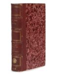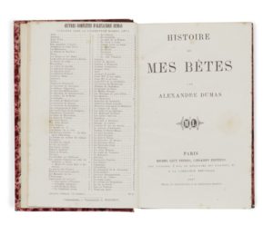 Alexandre DUMAS. Recueil factice de deux ouvrages. Un volume in-18, demi-chagrin rouge, dos à nerfs orné de quadruples caissons et d’une rose des vents dorés, tranches mouchetées (Reliure de l’époque). Nos amies les bêtes… 1) – Histoire de mes bêtes. Paris, Michel Lévy Frères, 1867. [2] ff., 333 pp. Édition originale complète. Une édition autorisée pour la Belgique et l’étranger, incomplète, avait paru en 1858 à Naumburg sous le titre Histoire d’un chien et de onze poules. Dumas y retrace avec l’émotion l’histoire des bêtes qui lui ont appartenu qu’il entremêle de souvenirs de chasse. Munro, 311. 2) – Le Capitaine Rhino publié par Alexandre Dumas. Paris, Michel Lévy Frères, Librairie Nouvelle, 1873. [2] ff., IV, 223 pp., [1] p. L’édition originale a paru chez le même éditeur en 1872. Un recueil de trois histoires de chasses. La première, qui donne son titre au volume, est traduite d’un article du Temple Bar Magazine écrite par « A Gentleman Tourist ». Elle se déroule en Afrique et raconte l’étonnante confiance qui s’instaure entre un homme et un rhinocéros qui s’allient pour mettre à mal un redoutable troupeau de panthères noires. Complètent le volume « Le lion père de famille » et « Une chasse au tigre ». Munro, 354. Coiffes, mors et coins, légèrement frottés, rousseurs. Chiffre doré en pied et cachet ex-libris sur la garde volante « St Germain ».