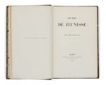 Alexandre DUMAS, Fils. Péchés de jeunesse. Paris, Fellens et Dufour, 1847. In-8, demi-maroquin à coins brun, filets dorés sur les plats, dos à nerfs orné, date dorée en pied, couvertures et dos conservés, non rognés (Reliure de Canape). [2] ff., 403 pp. Édition originale. Réunion des premières poésies de Dumas fils. Le volume, dédié à son père – son meilleur juge et son plus indulgent ami –, fut d’abord imprimé sous le titre Préface de la vie, qui est toujours celui du titre courant. L’auteur fit refaire la couverture, le faux-titre et le titre. On prétendit que le jeune poète chercha finalement à faire retirer le volume de la circulation. Il s’en défendit : « Ça n’est pas vrai. La vérité est qu’il n’en a jamais été broché qu’une centaine d’exemplaires sur lesquels 14 ont été vendus. Les bonnes feuilles apportées chez mon père, non pliées, servaient à envelopper les paquets. » Au reste Dumas Fils n’était guère satisfait d’avoir livré ses premiers essais au public si l’on en croit l’envoi qu’il inscrivit sur l’exemplaire de Michel Lévy : « A Michel Lévy qui a eu l’esprit de ne pas éditer ce livre-là ». Pourtant, il nous rappelle le souvenir de Marie Duplessis à qui l’année suivante Dumas Fils consacrera son ouvrage le plus célèbre, la Dame aux Camélias. Le dernier poème « M.D. », daté de février 1847, est une évocation émue et toute de regrets de la mort de cette jeune maîtresse qu’il avait délaissée et qui s’était éteinte le 3 février. Vicaire III, 449 ; Talvart, 2. Dos passé, mors et coins frottés, quelques taches sur la couverture. Agréable exemplaire sans rousseurs du deuxième ouvrage de Dumas Fils avec une émouvante évocation de celle qui lui inspira La Dame aux Camélias.