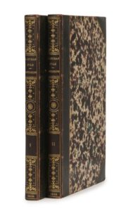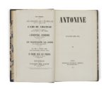 Alexandre DUMAS, Fils. Antonine. Paris, Hippolyte Souverain, 1850. 2 volumes in-8, demi-maroquin noir à coins, filets dorés sur les plats, dos lisses ornés, date dorée en pied, couvertures conservées, non rognés (Reliure de Canape). 338 pp., [1] f. ; 339 pp., [1] p. femmes du monde et grisettes Édition originale (1849) avec réimpression des titres à la date de 1850 (les couvertures sont bien à la date de 1849). Dumas Fils, fin observateur de la société de son temps, s’attacha notamment à peindre la destinée des femmes : Antonine, jeune fille de bonne famille, obtient d’épouser Edmond et leur amour qui devait durer s’émousse. Trois ans après le jeune homme la trompe : « J’ai vingt-six ans, je suis marié ; mais que diable ! Je ne compte pas ne vivre qu’avec ma femme, comme si j’avais soixante ans. » Nichette, la petite modiste, charmante enfant simple et joyeuse, connaîtra le sort de toutes les grisettes, son amant l’abandonnera pour épouser une jeune fille de son monde. Vicaire III, 457 ; Talvart, 8A. Mors frottés, couvertures tachées, rares rousseurs et pliures angulaires. Élégante reliure de Canape.