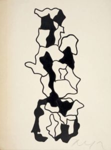 ARP (Hans). BRYEN (Camille). Temps troué. Dessins, bois originaux, papiers déchirés. Paris, P.L.F., Collection Le Soleil Noir, 1951, in-8, broché, couverture illustrée rempliée, 40 p., sous étui toilé de l'éditeur. Édition originale tirée à 320 exemplaires comprenant un portrait photographique de Bryen par Denise Colomb, déchiré par Arp, 6 bois originaux en noir et 2 dessins palingénésiques de Arp. Un des 20 exemplaires de tête numérotés sur Annam de Rives (n° 5) justifié par l'éditeur, François Di Dio, comprenant, sous une chemise cartonnée à part, un tirage supplémentaire du portrait déchiré de Bryen, une suite des 6 bois gravés en couleurs et un DESSIN ORIGINAL DE ARP À L'ENCRE DE CHINE, SIGNÉ AU CRAYON. De plus, l'un des bois en noir dans le livre est rehaussé à l'aquarelle. Rare en tirage de tête. Le Soleil Noir, Nîmes, 1993, 5.