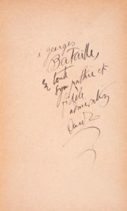 AUDIBERTI (Jacques). Des Tonnes de Semence. Paris, N.R.F., 1941, in-12, relié pleine toile rouge, pièce de titre de maroquin, couverture et dos conservés, non rogné, (reliure de S. Korcarz-Quentin), 158 p. Édition originale. Service de presse (pas de grand papier), envoi autographe signé à Georges BATAILLE, en toute sympathie et fidèle admiration. - Infanticide préconisé. Paris, N.R.F., 1958, in-12, relié pleine toile rouge, pièce de titre de maroquin, couverture et dos conservés, non rogné, (reliure de S. Korcarz-Quentin), 287 p. Édition originale. Service de presse, envoi autographe signé à Jacques Brenner. Prière d'insérer joint. - Dimanche m'attend. Paris, N.R.F., 1965, in-8, broché, 288 p. non coupé. Édition originale. Un des 50 exemplaires numérotés sur pur fil (seul grand papier).