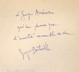 BATAILLE (Georges). L'Orestie. Paris, Éditions des Quatre Vents, 1945, in-8, broché, couverture rempliée, 86 p. Édition originale. Tirage unique à 260 exemplaires tous numérotés sur papier nacré teinté (175 + 25 H.C. et 60 réservés aux souscripteurs). Bel envoi autographe signé : à Georges Ambrosino qui me prouve que l'amitié ressemble au vin Georges Bataille. Provenance des plus intéressantes, Georges AMBROSINO, chercheur en physique nucléaire, fut l'un de ses proches amis. Il participa aux côtés de Bataille à l'aventure Contre-Attaque et fut membre du groupe Acéphale. Légère insolation à la couverture.