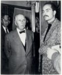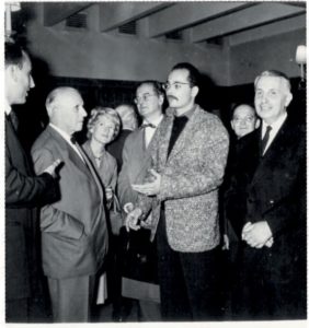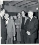 BATAILLE (Georges). 3 PHOTOGRAPHIES ORIGINALES EN NOIR ET BLANC (format 18,5 x 13, 17 x 12,5 et 17,5 x 12,8 cm. (1957). Tirages de l'époque. Les deux premières avec Jérôme Lindon, Gaston Gallimard, Jean-Jacques Pauvert (et sa femme), Georges Bataille. La troisième Gaston Gallimard et Jean-Jacques Pauvert. Ces photographies ont été prises en octobre 1957 lors du cocktail organisé au Bar du Pont-Royal pour les 60 ans de Georges Bataille et pour la sortie conjointe de trois de ses livres : Le bleu du ciel (Éditions Pauvert), La Littérature et le mal (Éditions Gallimard) et L'Érotisme (Éditions de Minuit). C'est la première fois que l'attention était portée sur la personnalité sulfureuse de Georges Bataille. Le Figaro littéraire lui consacre un article, l'Observateur publie un entretien - c'est à cette occasion qu'à la question de Marguerite Duras, s'il pouvait exister une «apparence extérieure» signifiant la souveraineté, il répond «une vache dans un pré» - et Pierre Dumayet l'invite à son émission télévisée Lectures pour tous. Indications manuscrites de Pauvert au dos des photographies, ainsi que la mention : Ne pas reproduire - Interdit par Pauvert ! Documents rares et peu reproduits.