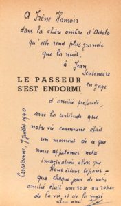 BOUSQUET (Joë). Le Passeur s'est endormi. Paris, Denoël, 1939, in-12, broché, 291 p. Édition originale. Service de presse, bel envoi autographe signé : A Irène HAMOIR dans la chère ombre d'Adela qu'elle rend plus grande que la nuit. A Jean SCUTENAIRE en gage d'amitié profonde - avec la certitude que notre vie commune était un moment de ce que nous appelâmes notre imagination alors que nous étions séparés - que chaque jour notre amitié était une rose au rosier de la vie et de la mort, leur ami Joe Bousquet, Carcassonne, 1 juillet 1940. Une photographie de Raoul Ubac est reproduite dans le numéro 2 de la revue belge «L'Invention collective» (1940) pour illustrer le texte d'Irène Hamoir - dédicataire de cette photographie - Romantique Adela. La photographie représentant la femme d'Ubac, Adela, allongée nue dans une écorce de tronc d'arbre.