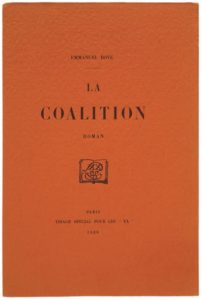 BOVE (Emmanuel). Visite d'un soir. Paris, Émile-Paul frères, Les Cahiers du Mois, 1925, in-8, broché, 88 p. Édition originale. Un des 50 exemplaires de tête numérotés sur Arches. - La Coalition. Paris, Émile-Paul frères, 1928, grand in-8, en feuilles, 327 p. Édition originale. Un des 20 exemplaires réimposé in-8, numérotés sur vélin d'Arches, signé par l'auteur, sous double couverture dont la seconde spéciale pour la «Société des XX». Le dos de la chemise éditeur est manquant. Un chapitre de La Coalition était paru précédemment dans un tirage à 30 dans la collection «Les Introuvables». - L'Amour de Pierre Neuhart. Paris, Émile-Paul frères, 1928, in-12, broché, 214 p. Édition originale. Tirage à 590 exemplaires. Un des 75 exemplairs numérotés sur pur fil Lafuma.