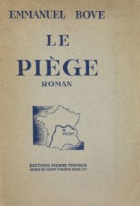 BOVE (Emmanuel). Monsieur Thorpe. Paris, Éditions Lemarget, collection Les Deux Masques, 1930, in-8, broché, couverture rempliée, 110 pages. Édition originale. Un des 20 exemplaires exemplaires de tête numérotés sur Japon. - Le Beau-fils. Paris, Bernard Grasset, 1934, in-12, broché, 373 p. Édition originale. Un des 26 exemplaires de tête numérotés sur vélin pur fil. - Le Piège. Paris, Éditions Pierre Trémois, 1945, in-8, broché, 191 p., grandes marges. Édition originale de l'un des meilleurs romans de Bove, et l'un des plus troublants. Un des 110 exemplaires numérotés sur vélin du Marais, seul grand papier.