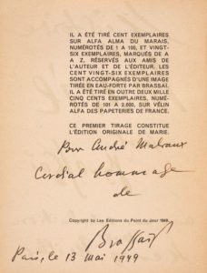 BRASSAÏ. Histoire de Marie. Avec une introduction par Henri MILLER. Paris, Le Point du Jour, 1949, petit in-12, broché, 90 p. Édition originale numérotée sur vélin Alfa. Envoi autographe signé : Pour André MALRAUX cordial hommage de Brassaï Paris, le 13 mai 1949.