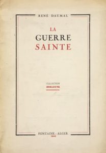 DAUMAL (René). Le Contre ciel. Lithographie originale d'Etienne Cournault. Paris, Université de Paris, Cahiers Jacques Doucet, 1936, in-8, broché, 98 p., couverture rempliée. Édition originale dédiée à Roger Gilbert-Lecomte. Tirage à 315 exemplaires [10 Chine - 230 + 75 H.C. sur Auvergne]. Un des 230 numérotés sur Auvergne. Non coupé et sans les habituelles piqures. - La Grande beuverie. Paris, N.R.F., collection Métamorphoses, 1938, in-8, broché, 154 p. Édition originale (pas de tirage en grand papier), service de presse, envoi autographe signé à Jean BALLARD. - La guerre sainte. Alger, Éditions Fontaine, collection Analecta, 1940, plaquette in-8 (23,5 x 16,3), agrafée, (8 p.) Édition originale tirée à petit nombre (300 exemplaires) sur papier «Registre».