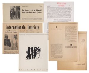 (DEBORD). INTERNATIONALE LETTRISTE N°1 à 4. Paris, Internationale Lettriste, décembre 1952 - juin 1954. COLLECTION COMPLÈTE. N°1 : Paris, décembre 1952, 27,3 x 21 cm, 8 p., 1 planche, en feuilles sous chemise à rabat imprimée. -Textes collectifs de Guy-Ernest Debord, Serge Berna, Jean-Louis Brau, Gil J. Wolman, etc. - Une planche de Wolman. N°2 : Paris, février 1953, une feuille 27 x 21 cm ronéotée recto-verso, tampon rouge «Internationale Lettriste». -Manifeste sur la provocation lettriste et l'exclusion d'Isou signé par Sarah Abouaf, Serge Berna, P. J. Berlé, Jean-L. Brau, Leibé Midou Dahou, Guy-Ernest Debord, Linda, Françoise Lejare, Jean-Michel Mension, Eliane Papaï, Gil J. Wolman. Autres textes de Debord, Wolman, Mension, Mohamed Dahou. N°3 : Paris, août, 1953, une feuille 43 x 27,3 cm imprimée recto seul. Contributions de Jean Louis Brau, G.E. Debord, G.M. Langlais, G.J. Wolman, Pierre-Joël Berlé. N°4: Paris, juin 1954, une feuille 30, 5 x 31 cm imprimée recto seul: La Guerre de la Liberté doit être faite avec Colère. Pour l'Internationale Lettriste : Henry de Béarn, André-Frank Conord, Mohamed Dahou, Guy-Ernest Debord, Jacques Fillon, Gilles Ivain, Patrick Straram, Gil J. Wolman. Avec une photographie du groupe. Collection rare complète et en très bon état. Provenance: Georges Goldfayn.