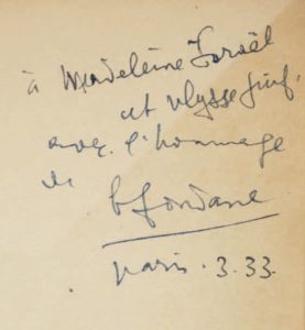 FONDANE (Benjamin). Ulysse. Bruxelles, Les cahiers du «journal des poètes», 1933, in-8, broché, 78 p. Édition originale. Un des 500 exemplaires numérotés sur Featherweight (seul tirage). Envoi autographe signé : A Madeleine Israël, cet Ulysse juif avec l'hommage de l'auteur, B. Fondane Paris 3. 33. - Faux Traité d'esthétisme. Essai sur la crise de la réalité. Paris, Denoël, 1938, in-8, broché, 126 p. Édition originale. - Baudelaire et l'expérience du gouffre. Préface de Jean Cassou. Paris, Seghers, 1947, in-8, broché, 383 p. Édition originale posthume.