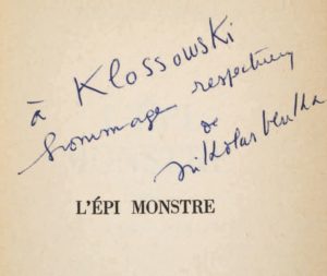 GENET (Jean). Miracle de la Rose. Décines, L'Arbalète, 1946, grand in-4, reliure de l'éditeur, 537 p. Édition originale tirée sur la presse à bras de Marc Barbezat. Typographie rouge et noire en caractères Bodoni de corps 18. Tirage limité à 475 exemplaires numérotés sur pur fil de Rives, tous réservés aux souscripteurs. - GENKA (Nikolas). L'épi monstre. Préface de Marcel JOUHANDEAU. Paris, René Julliard, 1962, in-12, relié pleine toile verte, pièce de titre de maroquin, couverture et dos conservés, (reliure de S. Korcarz-Quentin), 191 p. Édition originale. Service de presse. Envoi autographe signé : à KLOSSOWSKI hommage respectueux de Nicolas Genka. Publié en décembre 1961, L'Épi monstre connaîtra un certain succès de librairie avant d'être interdit par le ministère de l'Intérieur par un arrêté du 6 juillet 1962.