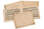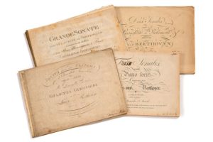 BEETHOVEN Ludwig van (1770-1827) BEETHOVEN Ludwig van (1770-1827). Cinq éditions anciennes de Sonates pour piano. Grande Sonate pour le Clavecin, ou Fortepiano... oeuvre XXVI [Op.26] (Leipzig, Bureau de musique, [ca 1802]), 19 pages, cotage 118 [Hoboken 136]. Première édition allemande, quasiment contemporaine de la première édition à Vienne chez Cappi. Sonata quasi una Fantasia Op.27 n° 2 [« Clair de lune »] (Vienna, Cappi, [ca 1806]), 15 pages, cotage 879 [Hoboken 144] (sous chemise verte toilée, marges un peu froissées et déchirées). Trois Sonates pour le Piano-forte, Op. 31, nos 1-3, « Edition tres Correcte. Prix 6 francs » (Bonn, Simrock, [1803-1804]), 65 pages (renumérotées à l'encre, coin réparé au dernier f.), cotage 345 [cf Hoboken 171-172]. Sonate für das Piano-Forte, Op.110 (Wien, Cappi & Czerny, [ca1826]), 15 pages, cotage N° 2500. Deux Sonates pour le Pianoforté et Violoncell... Op.102 Liv[raison] 1 [Sonate pour violoncelle op.102, n° 1] (Bonn: Simrock, [1817]), cotage 1337, en partition, sans la partie séparée de violoncelle, première édition [Hoboken 423]