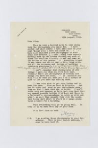 MOORE Henry (1898-1986). MOORE Henry (1898-1986). L.S. « Henry » avec 2 lignes autographes, Much Hadham 13 août 1952, à John ; 1 page in-8 dactyl. à son adresse (trous de classeur en marge) ; en anglais. Sur son travail de sculpteur. Il va envoyer les photographies demandées, ainsi que quelques photographies de nouveaux petits bronzes. Il expérimente encore la présentation de ses bronzes : certains sont modelés en cire et présentés sur le sol de son jardin. Sculpter en cire présente l'avantage de pouvoir réaliser facilement des formes filigranes sans avoir l'inconvénient de devoir construire des armatures. Il a beaucoup plus de travail de sculpture qu'à l'accoutumée, et est en train de commencer le projet d'une très grande sculpture pour un bâtiment…