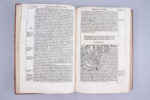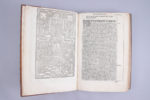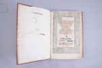 faictz dignes de mémoire advenuz tant en France / Italie / Espaigne /Angleterre / Hierusalem et autres royaumes tant chrétiens que sarrazins depuis le temps du déluge jusques à présent... Recueillis et mises en forme par noble et discret missire Jehan de Bourdigné prestre, docteur es droictz; et depuis reveues et additionnées parl le Viateur. Paris, Antoine Cousteau, janvier 1529 ; pour Charles de Boigne et Clément Alexandre, marchands-libraires demeurant à Angers. In-folio, (4 feuillets), 197 feuillets chiffrés 207. [a4 - AT6 - V6 - X6 - AALL6 - MM5]. Plein veau. Reliure établie vers 1700. (Marge de tête un peu courte : l'encadrement du titre gravé sur bois est amputé d'1 mm sur la partie gauche. Manque le dernier feuillet, MM6, qui porte la marque de Galliot du Pré). Rare édition originale de cette célèbre chronique d'Anjou, qui raconte de façon légendaire l'histoire ancienne de la province "depuis le Déluge", mais donne des renseignements précieux sur les périodes les plus récentes, en particulier les guerres d'Italie. Bourdigné revendique pour sa bonne ville d'Angers une origine "homérique" : "Comment après la finale destruction de Troye-la-grand une bende de Troyans pour lors appellez Angions arrivèrent au pays d'Anjou et édiffièrent de nouveau la ville d'Angiers" (feuillet 13). L'exemplaire appartient au type B selon Bechtel . Comme dans tous les exemplaires, la pagination saute de 149 à 160, sans manque. Beau titre bicolore avec portique gravé sur bois, avec en queue le nom de Galliot du Pré et l'une de ses deux marques, un cheval dans une prairie. Bois au verso du titre : deux anges présentent la couronne de France. Superbe bois à pleine page en face du feuillet 1 représentant l'auteur offrant son livre à Louise de Savoie, mère de François Ier. Autre bois, de toute fraîcheur, sur 1/4 de page, au feuillet 13. Toutes les capitales sont ornées. (Guy Bechtel : Catalogue des gothiques français, 1476-1560, page 96).