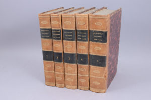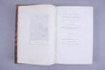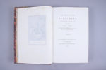 Théâtre Français) 1793-1798. 5 volumes grand in-4° (dimensions intérieures : 285 X 192 mm). 1/2 basane, dos sans nerfs. (3 mors épidermés ou fendus sur 5 cm ; petite desquamation sur le plat du tome V. Quelques serpentes déchirées). Ouvrage illustré de 112 belles figures de Moreau le Jeune (dont 4 frontispices), protégées par des serpentes de Chine. Remarquable impression de Didot sur vélin fort. Parfait état intérieur.