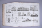 l'Yvette et de Bièvre à Paris. Paris, Imprimerie Royale. 1782-1783 2 volumes grand in-folio (590 X 420 mm). (6 ff) et 112 pages ; (2 ff) et 154 pages. 67 superbes planches hors-texte gravées sur cuivre, la plupart doubles et dépliantes, d'après Eustache de Saint-Far, numérotée 1 à 66 (il y a une planche 39 bis). Bien complet de la page d'Avis au relieur. 1/2 veau maroquiné cerise établi vers 1830. (Le portrait de Perronet manque. Quelques légères rousseurs. Coiffes et coins frottés. Quelques épidermures). Edition originale de ce très remarquable ouvrage de Perronet, Premier Ingénieur des Ponts et Chaussées de France -et directeur de l'Ecole depuis sa fondation en 1747. . Cette publication luxueuse de l'Imprimerie Royale est imprimée sur papier vélin fort. Le texte est mis en valeur par des encadrements gravés. Jean-Rodolphe Perronet est à l'origine de bon nombre des grands travaux publics réalisés au XVIIIème siècle. Il a dressé les plans des ponts de Neuilly, de Nemours, de la Concorde (Pont Louis XVI), de Sainte Maxence sur l'Oise, de Nemours sur le Loing et en a surveillé l'exécution. On lui doit aussi le grand égout de Paris, le canal de Bourgogne, etc... Il est l'inventeur d'extraordinaires machines représentées dans les illustrations : dragues, pompes, "camions", scies sous-marines, etc... Assurément le plus beau et le plus fascinant ouvrage sur les ponts et chaussées publié au XVIIIème siècle.