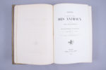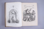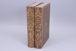 ; Paris, Hetzel, 1842 (tome II). 2 volumes grand in-8, plein veau havane. Filet doré d’encadrement sur les plats, large plaque d’arabesques frappée à froid sur tout le plat ; couronne comtale poussée à l’or au centre des plats avec les initiales C.H. Dos ornés d’arabesques poussées à l’or, dans lesquelles s’inscrivent des fers animaliers. Roulette au lotus sur les chasses. Toutes tranches dorées. (infime défaut en queue du mors du plat supérieur du tome I. Quelques très légères rousseurs). Exemplaire séduisant d’un des chefs-d’oeuvre de Grandville, en premier tirage, conformément aux remarques de Brivois et de Carteret. L’ouvrage est illustré de 2 frontispices, 199 planches hors-texte et de très nombreuses vignettes, parfaits exemples de l’illustration anthropomorphique. Les textes sont de Balzac, L. Baude, E. de La Bédollière, P. Bernard, Jules Janin, E. Lemoine, Charles Nodier, George Sand, Alfred de Musset, Paul de Musset ; Mme Ménessier-Nodier et Louis Viardot. (Carteret, III, pages 553 à 559)