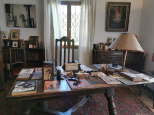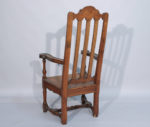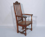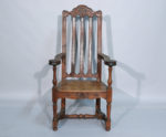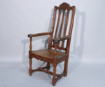 provenant de sa villa de Menton. Long. 129 Larg. 100 Haut. 74 cm. Fauteuil caquetoire en chêne mouluré et sculpté, le dossier ajouré est décoré de frises et de motifs végétaux. Les accotoirs renversés finissent en volutes décorées en leur centre de fleurs. Assise trapezoïdale ornée en ceinture de motifs végétaux et floraux. L'ensemble repose sur deux pieds antérieurs de forme balustre et deux pieds arrières droits rejoints par une entretoise. Travail anglais ou liégeois de la fin du XIXe siècle dans le style Louis XIV. Haut. 120 Larg. 67 Prof. 55 cm. (usures) En provenance de sa villa de Menton.