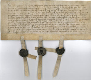 CHARTE MÉDIÉVALE ALLEMANDE, XVe SIÈCLE ? Charte manuscrite écrite en allemand, sur parchemin, 25,5 x 11 cm, avec trois beaux sceaux de cire armoriés appendus sur queues de parchemin. Il pourrait s’agir d’un traité concernant Johan von...