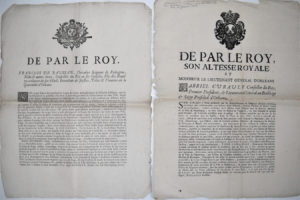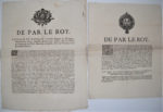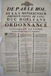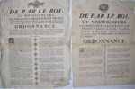 majorité env. 50 x 37 cm, bel état de conservation (plis, rousseurs). Ordonnances contre la mendicité sur la voie publique, interdiction de plantation de nouvelles vignes, taxation des droits de péage perçus sur les grains, farines et légumes, contre le dépôt de fumiers et d’immondices sur la voie publique, défense aux laboureurs de cultiver leurs terres qui joignent la grande route de Paris à Chartres à moins de 12 pieds de largeur de chaque côté des accotements, préservation des arbres des grands chemins afin que les laboureurs ne les endommagent pas avec leurs charrues, conduite des troupeaux de bestiaux sur les routes, faire écheniller les arbres fruitiers et autres et de faire brûler sur le champ les fourreaux, bourses ou toiles de chenilles « à cause de la multitude prodigieuse de chenilles qu’il y a eu cette année dans la campagne », interdiction aux cabaretiers de retenir les outils des paveurs des routes auxquels ils fournissent à crédit le vin qu’ils consomment, suppression de toutes les enseignes, échoppes, boutiques mouvantes et autres saillies sur la voie publique, etc. Provenance : par descendance, Eugène Vignat (1815-1895), maire d’Orléans de 1856 à 1869 et député du Loiret (1869-1870).