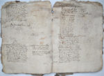d’Hangouart, auteur de « Analyse généalogique des Archives de la Maison d'Hangouart. 900 ans d'histoire d'une vieille famille de Lille », publié en 1930. Actes en majorité passés et signés entre 1555 et 1596 (baux de maisons et terres, jugements, achats de terres, etc), dont : Chassereau [ou censier] pour les fiefs et seigneuries de la Mairie de Gondecourt et de Mezédon appartenant à Guillaume de Hangouart écuyer sieur de Piètre, 1557, 62 pp. in-4 (en l’état) ; Achat et bail du moulin à bled de la Mairie de Gondecourt par Guillaume Hangouart écuyer sieur de Piètre (1568) ; Bail de cense de la Mairie de Gondecourt (1569) ; Droits de démolir, bâtir et planter (1571) ; Transaction entre Guillaume Hangouart et son fermier de la Mairie de Gondecourt au sujet du revenu du fief (1573) ; Lettres de reconnaissance par Guillaume Hangouart sieur de Piètre touchant la grâce par lui accordée à Piat Testelin et sa femme demeurant à Gondecourt pour les édifices et arpentages par eux érigés contre les droits et possessions du seigneur (1578) ; Gagement de droits au seigneur pour vente de vin à Gondecourt sur le fief appartenant à Guillaume Hangouart (1585) ; Table des occupeurs et de quelques tenanciers des seigneuries de la Mairie de Gondecourt et de Mezédon jusqu’en 1789, 72 pp. in-4 ; etc. PLUS DE DESCRIPTIONS DANS LE CATALOGUE DE LA VENTE SUR ROUILLAC.COM SOUS L'ONGLET /CONSULTER LES DÉTAILS DE LA VENTE/