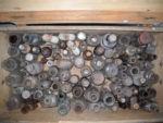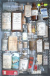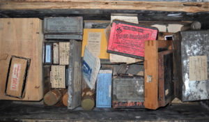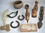outillage et produits divers pour le tirage des photos, des paquets de cartouches pour revolver d’ordonnance modèle 92, des objets d’art en bronze et en bois dont 2 lourds bracelets de cheville pour jeunes filles en âge de mariage. Une seconde malle en bois (66 x 35 x 30 cm) contenant plus de 130 flacons de produits médicamenteux et hygiéniques, vendus en France et en Tunisie, vers 1880-1910.