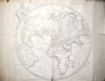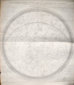 projeté sur le plan de l'équateur, avec l'approbation et sous le privilège de l'Académie Royale des Sciences / dédié et présenté au Roi, par le R.P. Chysologue de Gy, en Franche-Comté, Capucin 1778, et Planisphère céleste austral projeté sur le plan de l'équateur, avec l'approbation et sous le privilège de l'Académie Royale des Sciences / dédié et présenté au Roi, par le R.P. Chysologue de Gy, en Franche-Comté, Capucin 1778 », env. 100 x 68 cm (enroulées, piqûres et déchirures en marge, petits plis). Ces deux rarissimes estampes représentent le planisphère céleste complet réalisé par Chrysologue de Gy, père Capucin du couvent de la rue Saint-Honoré, élève de Pierre Charles Le Monnier, célèbre astronome de l'académie des sciences. Le père Chrysologue améliore les planisphères existants en y ajoutant les neuf cents étoiles du Cœlum australe de Nicolas-Louis de Lacaille. Poussé par Lemonnier son professeur, Chrysologue de Gy publie ces deux planisphères en 1778 approuvés par l'académie et sous son privilège. Ces deux grands planisphères représentent les deux hémisphères célestes dans une projection polaire stéréographique convexe, ayant la projection des pôles terrestres comme centre et la projection de l'équateur comme circonférence extérieure. Cette paire d’estampe est l’une des meilleures synthèses de représentation de la carte céleste à la fin du 18e siècle : 4466 étoiles, 79 nébuleuses, mises à jour précises des observations de Flamsteed, Hevelius, Halley, Le Monnier, Lacaille et 900 de ses étoiles, Messier et Mayer. Les étoiles, identifiées par des lettres selon la méthode Bayer, sont divisées en 14 classes. Les limites zonales des constellations sont définies par des pointillés sinueux, l'auteur est obligé de faire ce choix pour rendre unique l'appartenance des nombreuses étoiles présentes à une seule constellation. Cependant, il ne renonce pas à représenter le personnage mythologique qui est dessiné en s'inspirant du style des cartes Senex. De nombreuses constellations non ptolémaïques pour l'hémisphère Nord : Antinoüs, la Girafe, le Camelopard, le Monocéros, la Chevelure de Bérénice, la Mouche, la Licorne, le Cœur de Charles II, le Mont Ménal, le Renne, les huit constellations boréales d'Hévelius, le Rameau et Cerbere. Pour l'hémisphère sud : La Croix, Rhomboide, Chêne de Charle II, Ecu de Sobieski, Mont de la Table, le Solitaire et les douze de Keyser et Houtman immortalisés dans l'atlas de Bayer de 1603. Les noms des constellations sont en français. Le cercle de l'équateur, qui forme le périmètre des hémisphères, montre une échelle graduée divisée en unités de 15 secondes d'arc d'ascension droite. Sur le pourtour extérieur des tables se trouve une triple échelle graduée, la première en 24 heures divisée en 60 minutes corrélée au mouvement du Soleil, les deux autres en 360° qui identifient la longitude terrestre ayant comme méridien de référence. Dans les coins inférieurs de la carte de l'hémisphère nord, il y a deux cartes détaillées des Pléiades et des Hyades de Pierre Charles Le Monnier. • « Hémisphère supérieur de la mappemonde projettée sur l'horizon de Paris, et dédié à Monseigneur le Dauphin par le P. Chrysologue de Gy en Franche Comté, 1774 », avec rehauts de couleurs d’époque, 69 x 100 cm (plis, déchirures en marge). Provenance : par descendance, Eugène Vignat (1815-1895), maire d’Orléans de 1856 à 1869 et député du Loiret (1869-1870).