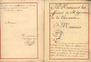 marquis de Louvois (1639-1691), secrétaire d’Etat de la Guerre, parchemin oblong ; Commission de capitaine d’une compagnie de nouvelle levée dans le régiment de Normandie ; • 8 L.A.S., vers 1752, Louis Antoine de Rouillé de Roissy (1690-1764), chevalier, seigneur de Clichy la Garenne, conseiller du roi en sa cour de parlement, adressées à Joseph Desjardins de Lauzon, officier supérieur au régiment des grenadiers de France stationné à Nancy, 16 pp. in-8 (tâches) ; intéressante correspondance relative à l’intégration et à l’éducation d’Augustin Louis Marie Rouillé de Roissy (1732-1781) dans une compagnie du corps des Grenadiers de France, futur colonel du régiment à partir de 1757 ; • Annales du régiment de la Couronne depuis sa création, 1766, par monsieur Picault capitaine aide major dans ce régiment, manuscrit composé de 14 petits cahiers in-8 (+ de 400 pages), frontispice dessiné à la plume, incomplet (manque p.49 à p.96), seconde moitié du XVIIIe siècle. Rare manuscrit, dont un seul exemplaire connu est conservé à la bibliothèque Mazarine à Paris (Ms 2862) ; Joint : Vicomte Oscar de Poli, Le Régiment de la Couronne (1643-1791), Paris, Conseil héraldique de France, 1891, br. in-4, 370 pp. (en l’état) ; • 12 billets de sortie de l’hôpital royal à Gand, avril-août 1748, du régiment de Montboissier, compagnie du chevalier de Cabassolle, qui prit part, durant la guerre de Succession d’Autriche, au siège de la ville de Maastricht au printemps 1748 ; • 13 planches imprimées extraites de l’ordonnance du roi pour régler l’exercice de l’infanterie du 1er janvier 1766, planche n°20 au n°33. PLUS DE DESCRIPTIONS DANS LE CATALOGUE DE LA VENTE SUR ROUILLAC.COM, SOUS L'ONGLET /CONSULTER LES DÉTAILS DE LA VENTE/