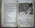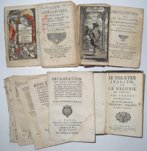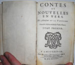 déport et de son origine ». Rouen, Du Petit-Val, 1630, 34 pp. in-8 ; • « Officium beatae Mariae virginis. Suivi de Oraisins pour tous chrestiens et catholiques ». Paris, chez Michel Ballagny, 1635, rel. in-8 aux plats et dos richement décorés (en l’état, manques, frottements), 29-395-46 ff. ; • Heinrich Ernst, « Variarum observationum libri duo », Amstelodami, Janssonium, 1636, br. 171 pp. et index ; • De Bouques et Despeisses, « Traité des successions testamentaires et à intestat ». Toulouse, Bosc et Colomiez, 1636. Rel. parchemin in-8, 659 pp. et tables ; • Jules Baron, « L’art héraldique contenant la manière d’apprendre facilement le blason ». Paris, Charles Osmont, 1680, rel. veau in-8 rapportée (en l’état), 159 pp. détachées, en l’état ; • Jean de La Fontaine, « Contes et nouvelles en vers. De Monsieur de La Fontaine. Nouvelle édition enrichie de tailles-douces ». 2 tomes en 1 vol. in-8. Amsterdam, chez Henry Desbordes, 1685, (18)-236-(8)-216 pp., frontispice et 58 vignettes de Romain de Hooghe (accdts, rest., déchirures) ; • « Arliquiniana ou les bons mots, les histoires plaisantes et agréables… » Paris, Florentin et Brunet, 1694, rel. in-8 (en l’état, épidermures), 227 pp. ; • Evariste Gherardi, « Le théâtre italien ou le recueil de toutes les scènes françoises qui ont esté jouées sur le théâtre italien de l’hôtel de Bourgogne ». Genève, Jacques Dentand, 1695, rel. veau in-8, 544 pp.