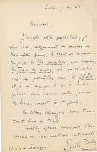 [Presse – Littérature] EMILE ZOLA (1840-1902) L.A.S., Paris, 9 décembre 1883, adressée à Jean Dupuy, président du conseil de surveillance et actionnaire du journal quotidien « Le Petit Parisien », 1 page in-8 : « Monsieur, j’accepte...
