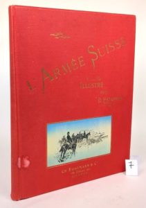 ESTOPPEY (David) : L'Armée suisse. Genève, Eggimann, 1894. Un volume. 30 par 41 cm. Plein cartonnage rouge illustré d'éditeur. Une petite tache sur le 1er plat, sinon parfait état de l'ouvrage. 73 pages, suivies de 34 Chromolithographies à pleine page, montées sur onglets, illustrant les uniformes de l'armée suisse. Très bel ouvrage