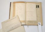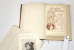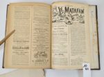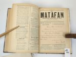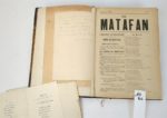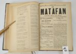 SAVOIE. Le MATAFAN, organe des savoyards de Paris. Parait tous les mois. Journal de savoie publié à Annecy, par J. Depollier et cie.   19 par 27,5 cm. Du N°1 au N°40, joint le N°56. Demi-chagrin brun d'époque à coins, dos 5 nerfs, caissons ornés, tête dorée. Reliure en bon état, intérieur en très bon état. La collection commence en septembre 1891, le N°40 est de décembre 1894.   Chaque numéro fait en général 4 pages, avec une partie en patois savoyard. Il y a de la poésie, parfois satirique, des informations artistiques, des nouvelles de Savoie, etc.   Exemplaire truffé de documents variés : ·         Plusieurs menus ou invitations au Dinna du Matafan, dont un avec un poème pour décrire les plats. ·         Un manuscrit intitulé La Chanson du Matafan, signée par César Bouchage. ·         Un manuscrit de deux feuillets, qui commence par : Patiente, ma femme, signé Alex 93. ·         Un manuscrit d'un dialogue, non signé ·         Un manuscrit intitulé Le Matafan, 2 pages non signées. ·         France & Savoie, chant patriotique : paroles sur deux pages. ·         Un prospectus de la société littéraire et artistique le Cyclamen. ·         Un menu du Petiout Matafan de Juillet 1892, illustré. ·         Quatre documents sur la Colonie Savoisienne ·         Un poème de François AYME pour le Matafan du 5 mars 1898. ·         Texte d'une chanson recueillie à Paris à la Santa du Payi (en patois de Thones). ·         Et une invitation pour le diner du Gratin savoyard Les Dinna semblent tenir une belle place dans la vie culturelle des Savoyards de Paris Un ensemble unique. Pour les étrangers à la Savoie, le MATAFAN est une espèce régionale de crêpe de pommes de terre