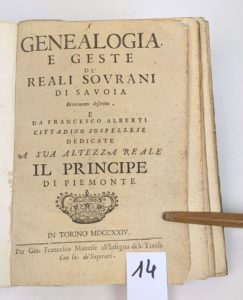[Savoie] ALBERTI (Francesco) : Genealogia e geste de reali sovrani di Savoia brevemente descritte, () dedicate a sua Altezza Reale Il Principe di Piemonte. Torino, Francesco Mairesse, 1724. Un volume. 14 par 20 cm. (6)-67 pages. Broché, sous cartonnage d'attente bleu et muet. Petits frottements sur le dos, papier légèrement assombri, une toute petite trace de mouillure en marge intérieure. 1ère édition de ce texte sur la Généalogie de Savoie, adressé au Prince de Piémont.