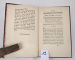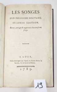 Les songes d'un philosophe solitaire. Seconde édition, revue, corrigée et augmentée d'un troisième songe. Loex, Petite montagne qui sépare la France d'avec la Savoie, sur le bord du Rhône, 1789. Un volume. 12,5 par 20,5 cm. 53 pages. Plein chagrin bradel lie de vin, dos muet. Page de faux titre très légèrement restaurée en marge, sinon très bon état de l'exemplaire. Premier numéro de ce pamphlet périodique dont il parut trois numéros.