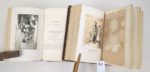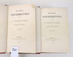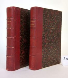 CORDAY (Aglaé de) : Les fleurs neustriennes poésies et la sorcière de Laredo. Mortagne, Loncin et Daupeley, 1855-1857. 2 volumes. 13 par 21 cm. LIX-423 ; 568 pages. Demi basane rouge d'époque, dos 5 nerfs. Reliure en état correct (quelques frottements sur les dos, coupes légèrement usées). Edition originale. Ouvrage illustré de 22 lithographies dont une en couleurs et certaines en bistre (complet). Ouvrage non mis dans le commerce L'auteur a corrigé de sa propre main certains titres et légendes d'illustrations et a remplacé au volume I des vers supprimés par la censure (p. 377-378-379). Aglaé de Corday, poète, reçut le jour au château de Baudry, près de Verneuil, commune de Rueil, canton de Brésolles, le 22 mars 1796. Parente de Charlotte de Corday par son mari, Mme de Corday (née de Postel), eut pour ami, et en quelque sorte pour professeur, Ancelot, de l'académie française. Indépendamment d'une foule d'élégies, d'épîtres et de pièces en vers, on lui doit: "Les deux soeurs" et "Dix mois en Suisse".