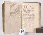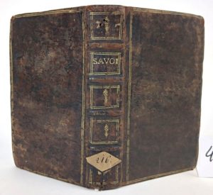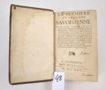 ARNAULD (A) - RECHIGNEVOISIN (J).] : La Première et la Seconde Savoisienne où se voit comment les Ducs de Savoie ont usurpé plusieurs états appartenant au Roi de France et les fausses propositions de paix faites pour le tromper, faire périr ses armées et assujettir l'Italie () Plus une description sommaire de tous les Princes de cette maison, jusques à l'An 1630. Grenoble, P. Marnioles, 1630. 2 parties reliées en un volume. 10 par 16,5 cm. (4)-XCII ; (4)-323 pages. Pleine basane brune d'époque, dos 4 nerfs, plats encadrés d'un double filet doré. Usures de la reliure, deux petits trous sur le dos. Mais exemplaire convenable néanmoins. Mouillure sur la totalité de l'ouvrage. Première édition collective.