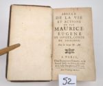 [MONTFALCON de] : Abrégé de la vie et actions de feu Maurice-Eugène de Savoye, Comte de Soissons, par le Sieur D. M. Paris, Girard, s.d. [1677 ?]. Un volume. 8 par 14,5 cm. (12)-299 pages. Pleine reliure d'époque, dos 5 nerfs, en mauvais état. Papier légèrement assombri, sinon bon état intérieur. Un livre rare, sur Eugène-Maurice de Savoie dit de Savoie-Carignan, né à Chambéry le 2 mars 1635, mort à Unna en Westphalie le 6 juin 1673, est comte de Soissons et de Dreux de 1656 à 1673 et nommé duc de Carignan en 1662.