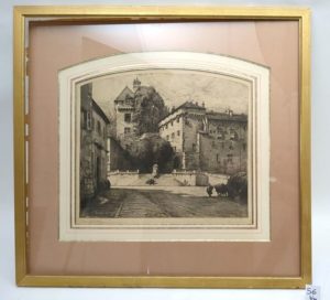 DREVET (Joanny). Château de Chambéry. Eau-forte originale tirée en noir à 40 exemplaires seulement. Celle-ci justifiée 4/40, signée au crayon en bas à gauche, contresignée en bas à droite avec un envoi : « souvenir bien amical à Mademoiselle Agnès ». Belle épreuve bien encadrée. Dim. (à vue) : 35.5 x 40.5 cm. Cadre : 63 x 67 cm. (Beccatini 116)