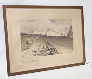 DREVET (Joanny). Chemin de la Redoute Ruinée en Tarantaise. Aquatinte en couleurs signée en bas à droite, contresignée en bas à gauche avec envoi : « à Monsieur Petigny, hommage très cordial » et justification 49/350. Il s'agit du chemin qui mène vers le fort de « La Redoute Ruinée », situé au Col de la Traversette à 2400 m d'altitude, au-dessus de Bourg Saint-Maurice, avec vue directe sur le Grand Saint-Bernard et le Mont-Blanc. Ce Fort fut construit en 1892 pour parer à d'éventuelles attaques italiennes, suite au rattachement de la Savoie à la France en 1860. Son rôle était de surveiller le Col de la Traversette et la Combe des Moulins. Il interdit aussi l'accès au col du Petit Saint-Bernard car il possède des vues directes sur celui-ci. Il prit le nom de « Redoute Ruinée » en hommage à l'ancien Fort Traverset, construit par la Maison de Savoie en 1630 sur la même ligne de crête, puis détruit lors de la Révolution Française. Entre les deux guerres, ce monument servit de camp d'entraînement aux Chasseurs Alpins. Du fait de sa position stratégique, le Fort fut le théâtre de plusieurs combats meurtriers lors de la seconde guerre mondiale. Dim. : 23.5 x 36 cm (cuvette). Cadre : 40.5 x 53 cm. (Beccatini 255).