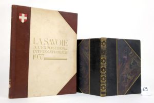 La Savoie à l'exposition internationale de 1937. Chambéry, Dardel, 1938. Un volume. 23,5 par 31 cm. 63-(16) pages, Demi-chagrin brun à coins plats en vélin décoré (reliure de l'éditeur). La seconde partie comporte 16 feuillets de reproductions, sous le titre Groupe Savoyard à l'exposition international de 1937, par H.J. Le Même, architecte, et M et J Vibert, décorateurs. Edition limitée à 175 ex., tous sur simili japon, celui-ci le 58. Exemplaire en très bel état. On joint TISSOT (Roger) : Au Mont Blanc. Grenoble, Rey, 1924. Demi-chagrin brun à coins. Bon état.