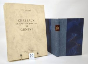 BLONDEL (Louis) : Châteaux de l'ancien diocèse de Genève. Genève, Jullien, 1978. Un volume. 22 par 30 cm. 490 pages, avec une carte dépliante en couleurs. Broché, parfait état. Avec SASSONE (Frédéric) : La Savoie armée pendant la guerre Franco-Allemande 1870 1871. Chambéry, Bonne et Conte-Grand, 1874. Un volume en demi-toile, très bon état.