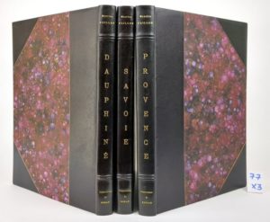 PAILLON (Maurice). Alpes de France. Savoie - Dauphiné - Provence. Paris, Editions Alpina, 1938 - 1941. 3 volumes grand in-4 [25 x 34 cm], 155 pp. pour chaque volume, demi-chagrin violine foncé à coins souligné d'un filet doré, dos à 2 nerfs, titre vertical doré, tête dorée, couvertures et dos conservés. (Reliures signées Montécot Sc Lavaux). 39 illustrations en couleurs de Marie Couturier (sous le pseudonyme d'Albert Doran) ainsi que d'héliogravures d'après les photographies de Jean Roubier. Edition originale numérotée sur Alfa (Perret, 3270). Très bel exemplaire.
