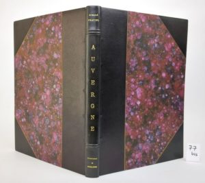 PRAVIEL (Armand) - BOUILLIERE (Edouard) - ROUBIER (Jean). Pays d'Auvergne. Paris, Alpina, 1936. Grand in-4 [25 x 34 cm], 155 pp., demi-chagrin violine foncé à coins souligné d'un filet doré, dos à 2 nerfs, titre vertical doré, tête dorée, couvertures et dos conservés. (Reliure signée Montécot Sc Lavaux). Edition originale numérotée sur Alfa ornée d'héliogravures d'après les photographies de Jean Roubier et des aquarelles de Edouard Bouillière. Très bel exemplaire dans une reliure strictement identique aux 3 ouvrages du lot précédent.